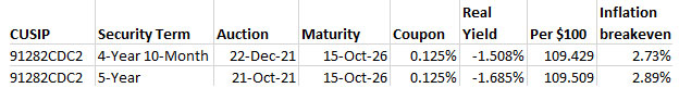 Original auction, Oct. 21, 2021: Another TIPS auction, another record low yield. The Treasury’s offering of $19 billion in a new 5-year TIPS generated a real yield to maturity of -1.685%, which still stands as the lowest ever recorded for any TIPS auction of any term. The 5-year inflation breakeven rate came in at 2.89%, by far the highest rate for any 5-year TIPS auction in more than a decade. The 5-year breakeven rate was last at this level in March 2005.