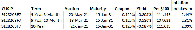 Reopening auction, May 20, 2021: The real yield came in at -0.805%, a bit higher than the record low. The inflation breakeven rate continued rising to 2.44%.