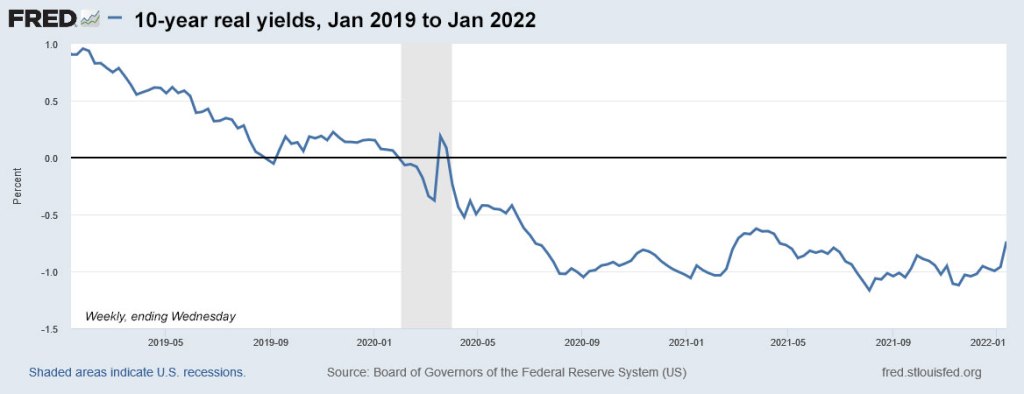Real yields (and nominal yields, too) have been rising after the Federal Reserve signaled it is ready to end its aggressive bond buying by March, and also likely to begin raising short-term interest rates in that month. We could see as many as four increases in short-term rates in 2022, and eventually, the Fed should begin reducing its $8.8 trillion stockpile of Treasurys and mortgage-backed securities.