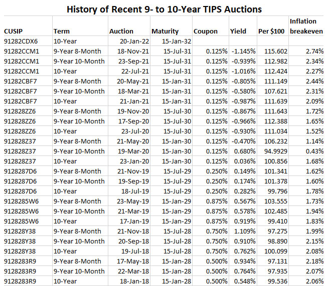 Thursday’s auction result closes at 1 p.m. EST for non-competitive bids, like the ones made at TreasuryDirect or a brokerage. I’ll be reporting on the auction results soon after the close. In the meantime, here is the recent history of TIPS auctions of this term. Note that Thursday’s result will be the 11th consecutive auction with a negative real return: