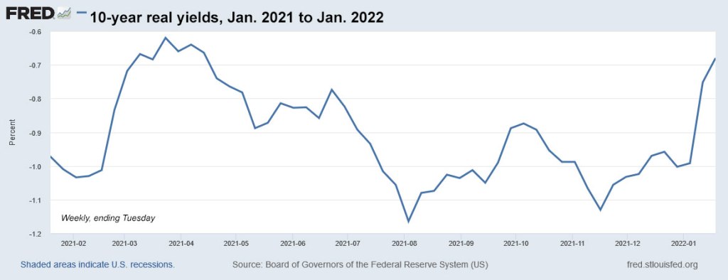 Real yields have been climbing in recent weeks, following signals that the Federal Reserve intends to stop bond-buying stimulus in March, and then begin raising short-term interest rates. Here is the trend in 10-year real yields over the last year, showing how yields have climbed since deep lows in August and November 2021: