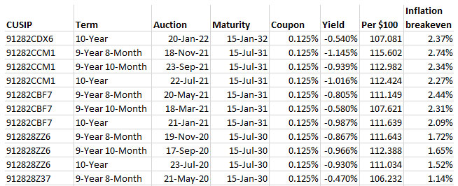 Anyway, this TIPS will get reopening auctions in March and May. Maybe we will see even better yields by then. Here’s a history of recent auctions, showing the string of 11 auctions of this term with negative real yields.
