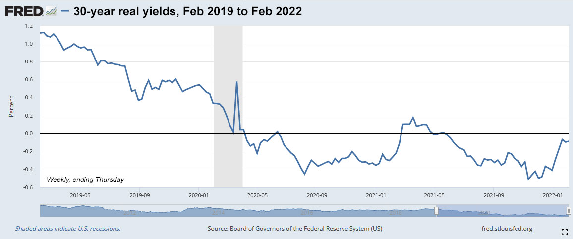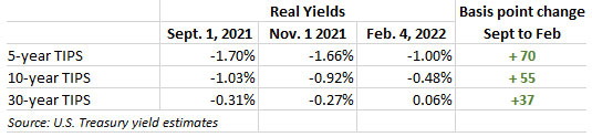 Now we are entering the “next era,” with inflation surging and the Federal Reserve almost certainly ready to raise short-term interest rates multiple times in 2022. Here is how real yields have increased over the last five months: