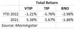 But I would still expect TIPS mutual funds and ETFs to have a difficult year in 2022, as interest rates rise. VTIP, with its shorter duration, should perform the best in this scenario, but it could still end up with a negative return for the year. Taking a longer view, higher real and nominal interest rates will be a positive for investors looking to add new money in inflation-protected investments.