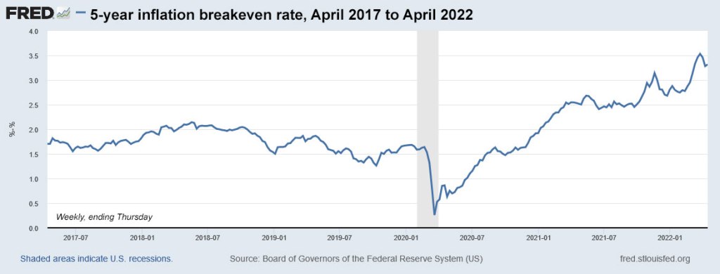 I can track 5-year inflation breakeven rates back to 2003, and at no time — until the last several months — has the 5-year inflation expectation ever exceeded 3%. We have entered a new era.