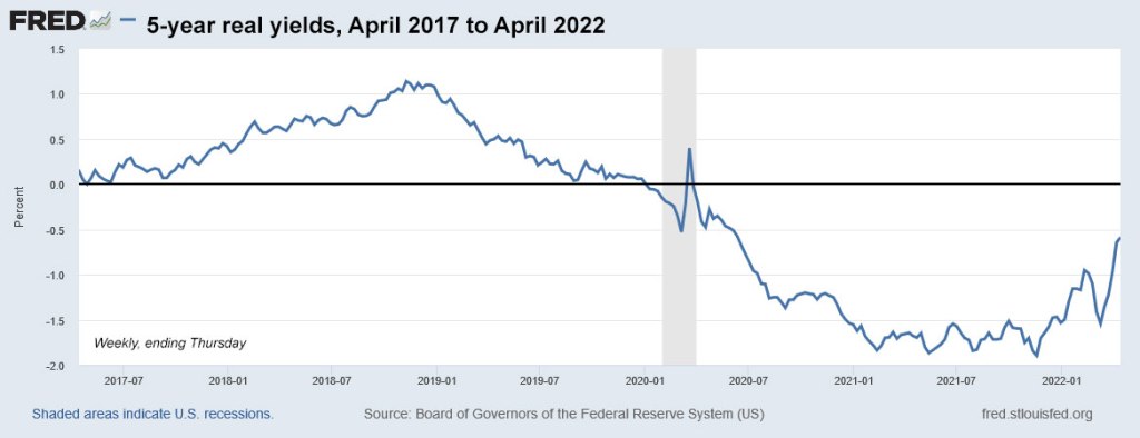 As of Thursday’s market close (no data for Good Friday), the Treasury estimated the real yield of a 5-year TIPS at -0.54%, a remarkable 104 basis points higher than where we started this year. Real yields — especially for shorter- and medium-term TIPS — have been surging in response to the Federal Reserve’s commitment to raise short-term nominal rates and also begin reducing its huge balance sheet of U.S. Treasurys.