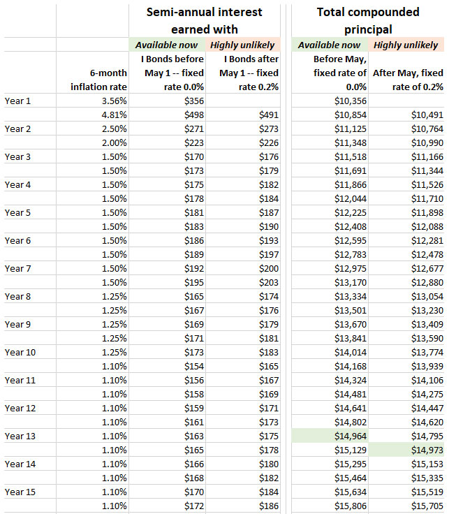 Let’s say the Treasury surprises us and raises the fixed rate to 0.2% for May to October purchases of I Bonds. That would be a shocker! (It won’t happen, but let’s pretend … ) On a $10,000 investment, that 0.2% bonus is worth $20 in the first year, and will compound slightly higher in future years.