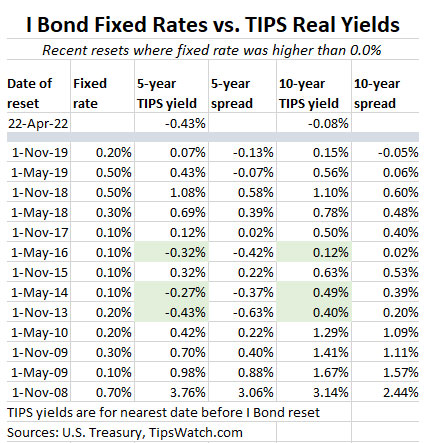 Here is a chart showing every instance where the I Bond’s fixed rate was set higher than zero, going back to 2008, and comparing that fixed rate with the then-current real yields of 5- and 10-year TIPS: