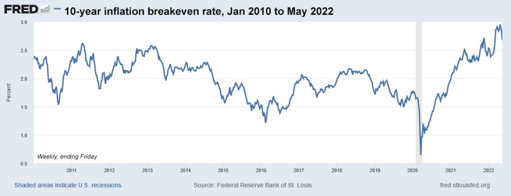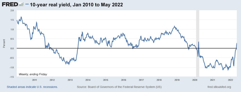 I’d say let’s relax and just see what happens. Real yields have been dipping lower for a few recent days. I bought that same 5-year TIPS at auction last month, with a real yield of -0.34%. It was a small purchase to add to my inflation-protected holdings. A lot can happen before the next auction on June 23. The Federal Reserve will meet the week before and is likely to raise short-term rates by 50-basis points. Of course, that is all priced in.