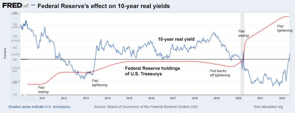 When the Fed eases — lowering short-term rates and adding to its Treasury holdings — real yields dip well below zero. When the Fed backs off, real yields normalize, above zero. That is where we are today. Except the huge difference in 2022 is that U.S. inflation is running at 8.3% and the Fed knows it has to act aggressively to raise rates and lower its balance sheet. We are only a small step along that process, in my opinion, but the bond market is already pricing in some of the future Fed actions.
