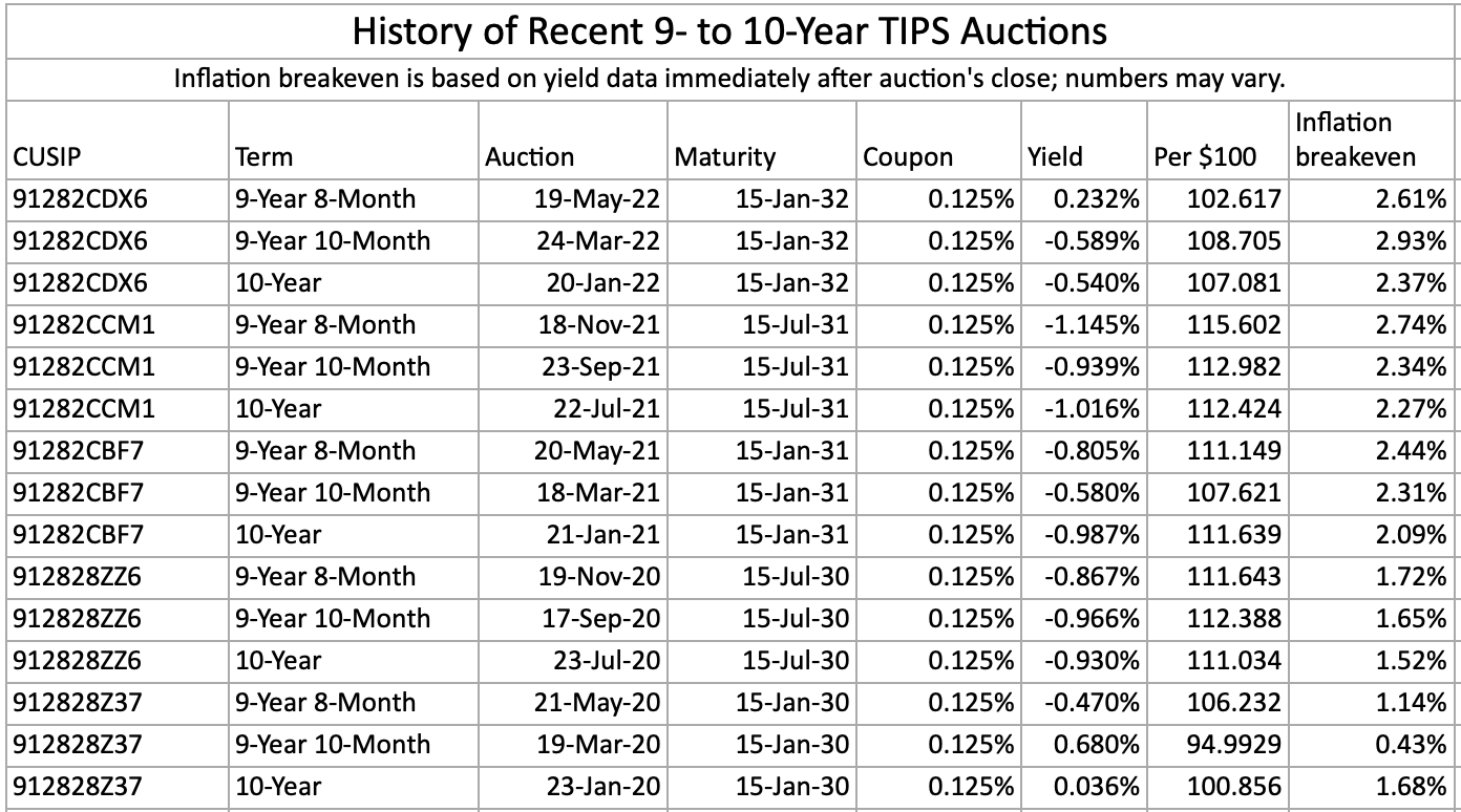 This was the first TIPS auction of this term to get a positive real yield in more than two years. And it was also the first 9- to 10-year TIPS auction to sell at a discount to par value in two years. I was hoping to see that result (since I was a buyer at this auction) and … whew … it happened.