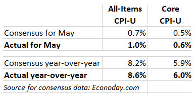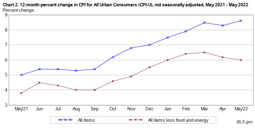 Seasonally adjusted U.S. inflation increased 1.0% in May, the U.S. Bureau of Labor Statistics reported today, much higher than the already-scary 0.7% predicted by economists. The year-over-year number rose to 8.6%, the largest 12-month increase since the period ending December 1981. Economists had been predicting the annual number would fall to 8.1%, down from April’s 8.3%.