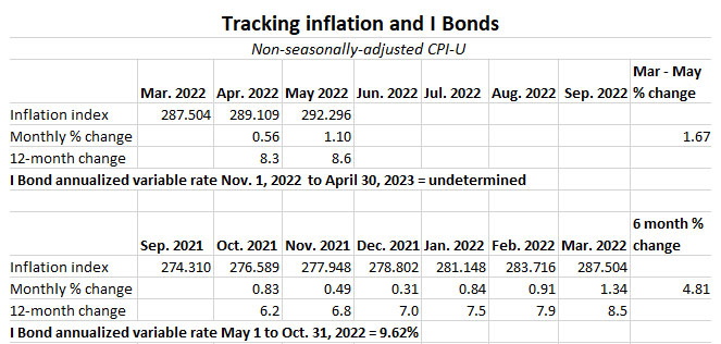 For I Bonds. The May number is the second in a six-month string that will determine the I Bond’s new variable rate, which will be reset on November 1 based on inflation from March to September. So far, just two months into this rate-setting period, the I Bond would get a variable rate of 3.34%. Since four months remain, a lot will change before the November reset.