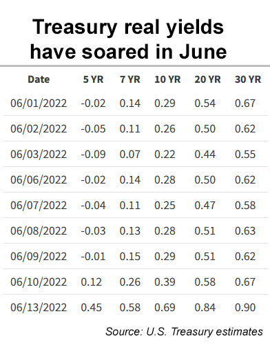 In the last two weeks — and especially after Friday’s high-side shocker of an inflation report — both nominal and real yields have surged higher, transforming a “meh” TIPS market into something very interesting: Real yields positive to inflation at a time of dangerously high inflation.