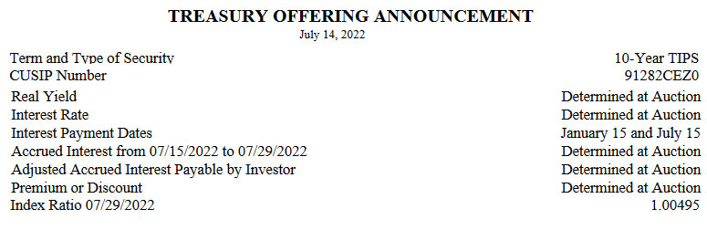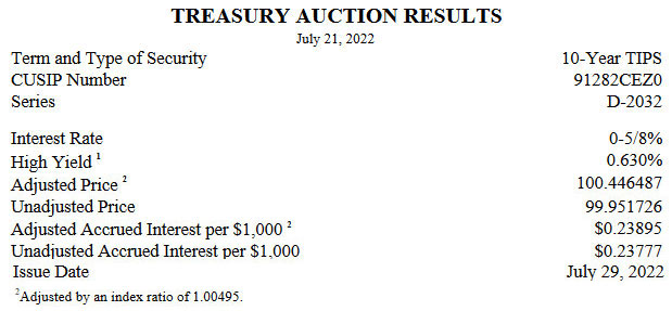 I hope this primer on TIPS pricing is helpful. The July 21 auction was an easy one because the real yield ended up just a hair above the coupon rate, making the unadjusted price very close to par. In the last two years that hasn’t be true, with negative real yields far below the lowest possible coupon rate of 0.125%. I am hoping we are entering a new era of positive real yields and much more sensible TIPS pricing.