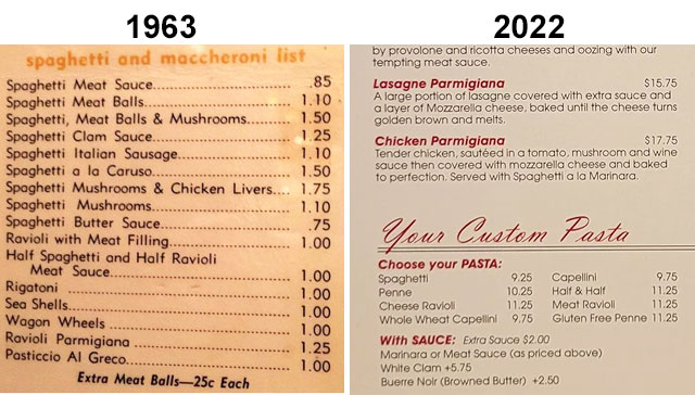 Want the more exotic Ravioli Parmigiana? That will cost you 1,140% more than it did in 1963, and probably destroy any hope you had of maintaining your diet. Want half spaghetti, half ravioli? (Good choice.) That will cost you $11.25 and I’d say that’s a bargain, but the price is 1,025% higher than the 1963 cost. So, dang, not really a bargain.