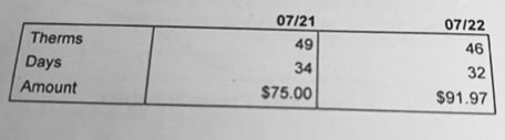 This week I received my natural gas bill for July. The cost was $91.97, which was 22.6% higher than the July 2021 bill. A year ago, in July 2021, we used more therms (49 vs. 46) and the bill was for more days (34 vs. 32), and even with that … the 2022 bill was 22.6% higher.