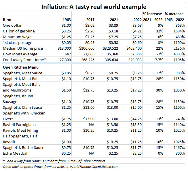 Want the more exotic Ravioli Parmigiana? That will cost you 1,140% more than it did in 1963, and probably destroy any hope you had of maintaining your diet. Want half spaghetti, half ravioli? (Good choice.) That will cost you $11.25 and I’d say that’s a bargain, but the price is 1,025% higher than the 1963 cost. So, dang, not really a bargain.