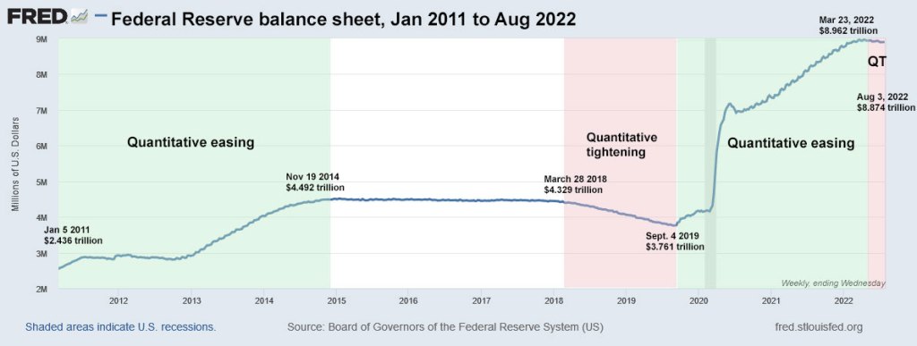I repeat, a reduction of 1% after an increase of 282% over a stretch of 11 years. This is what the Federal Reserve does when it implements quantitative tightening, at least so far into this inflationary crisis. Here is a look back at the Fed’s moves to “ease” and “tighten” over the last 11 years: