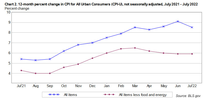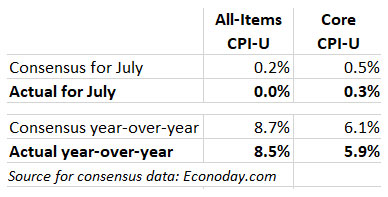 I warned you: Inflation numbers are notoriously fickle in the summer months, and so here we go: All-items U.S. inflation increased 0.0% in July on a seasonally adjusted basis, the Bureau of Labor Statistics reported today. The year-over-year number dipped to 8.5%, down from June’s 41-year-high of 9.1%.