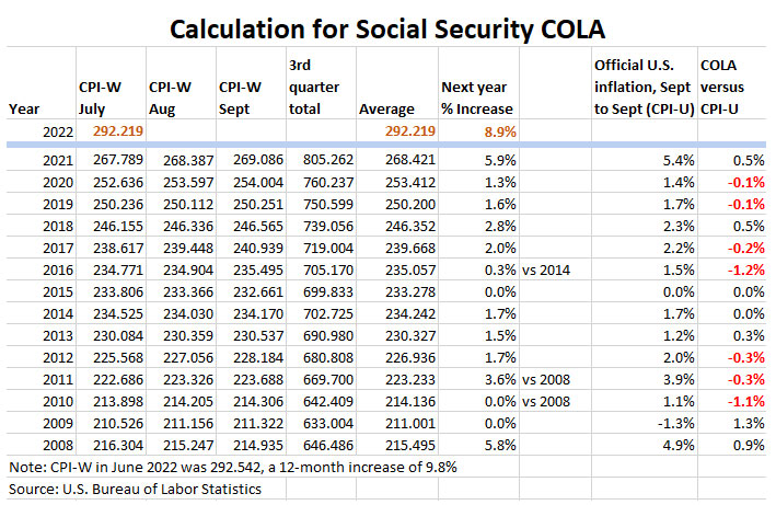 In a recent article, I predicted that the 2023 COLA would get an increase of 9.9% to 10.1%. That could still happen, but the current trend in gas prices should push the number lower. We’ll see. Last year, July inflation ran fairly hot (about 0.5%) but then cooled off in August and September. Here are the historical numbers used in this COLA calculation: