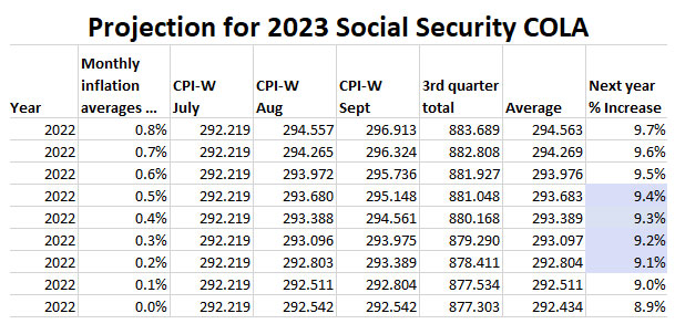 And here is my updated projection for the Social Security COLA in 2023, factoring in the slight deflation in the July index:
