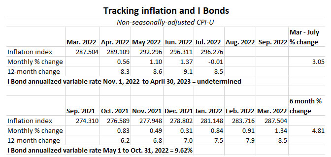 For I Bonds. The July report is the fourth of a six-month string that will determine the I Bond’s new variable rate, which will be reset November 1. As of now, inflation has increased 3.05% in that four-month stretch, which would translate to a variable rate of 6.1%, very attractive but well below the current rate of 9.62%. Two months remain, and a lot can happen in two months. Stay tuned. Here are the numbers so far: