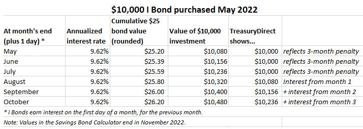 So is it safe to say that if I have a 10k I bond and it pays 9.62 for 12 months that at the end of the term I should have in my account 10,962 minus about 240 for the prior three months for a total of 10,722 give or take a few dollars. And if I cut that figure in half thats how much my account should have in 3 months. Does this work or no?