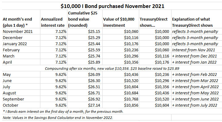 Here is the calculation for an I Bond purchased in November 2021, earning 7.12% for six months and then 9.62% for six months.