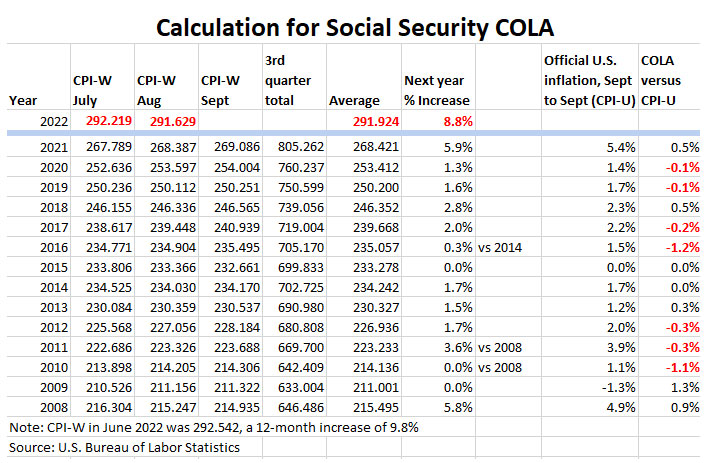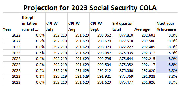For August, the BLS set CPI-W at 291.629, an increase of 8.7% over the last 12 months. However, CPI-W actually fell 0.2% for the month. But remember, it will be the average of July to September inflation indexes — compared to the same three-month average a year ago — that will determine the Social Security COLA. A year ago, that average was 268.421. If we have zero inflation in September, the COLA will be 8.7%.