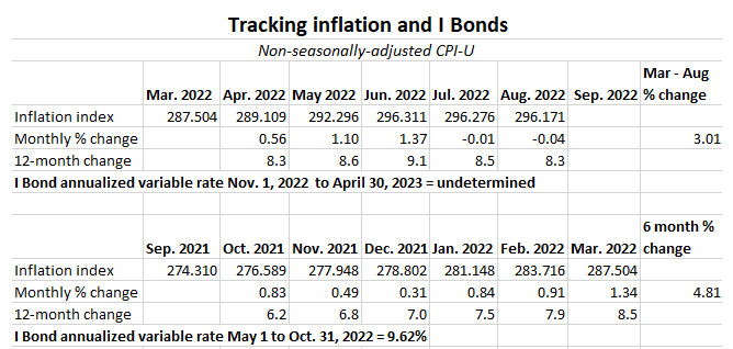 For I Bonds. The August report is the fifth in a six-month series that will set the I Bond’s new variable rate, which will begin rolling out November 1 for all I Bonds. As of August, inflation has run at a rate of 3.01%, which would translate to an I Bond variable rate of 6.02%, lower than the current rate of 9.62%. However, one month remains. Oil prices seem to have stabilized this month, so it’s possible we will see a higher number. Here are relevant data: