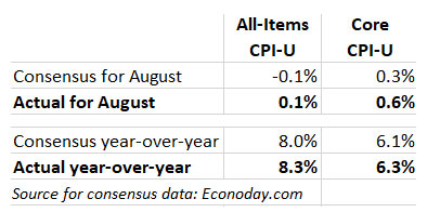 Surprises, surprises. Financial markets, which had been rallying over the last week on expectations of falling prices, got an inflation reality check today: Seasonally adjusted U.S. inflation rose 0.1% in August, and 8.3% over the last year, the Bureau of Labor Statistics reported.