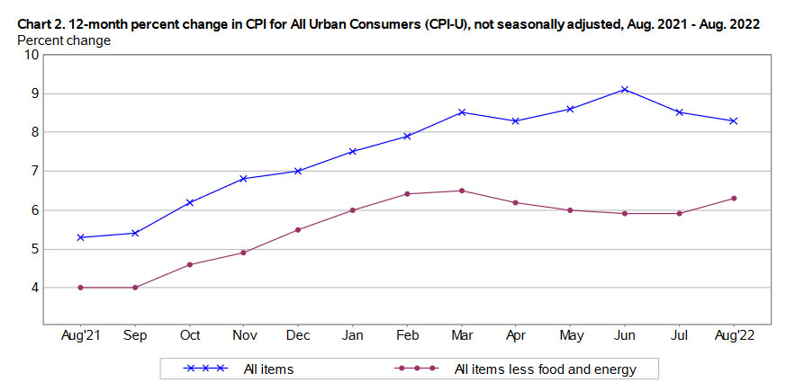 The S&P 500 just opened for trading today and it is down about 2.3%, after flashing higher minutes before the August inflation report was released. The reason: The markets are losing hope — a false hope in my opinion — that the Federal Reserve would begin easing off on tightening as U.S. inflation drifts lower. Although the monthly all-items number looks mundane, this was an ugly inflation report, with prices increasing across the economy despite a quick and steep decline in gasoline prices. Core inflation jumped from an annual rate of 5.9% in July to 6.3% in August.