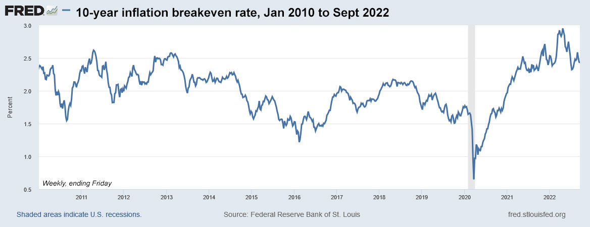 Here is the trend in the 10-year inflation breakeven rate since January 2010, showing how inflation expectations have been backing off since the Fed began tightening measures in March 2022: