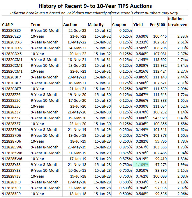 This same 10-year TIPS will be reopened at auction again on Nov. 17, giving investors one more chance at it. Here’s a history of all 9- to 10-year TIPS auctions dating back to January 2018. I have highlighted the single auction, in November 2018, with a real yield above 1%.