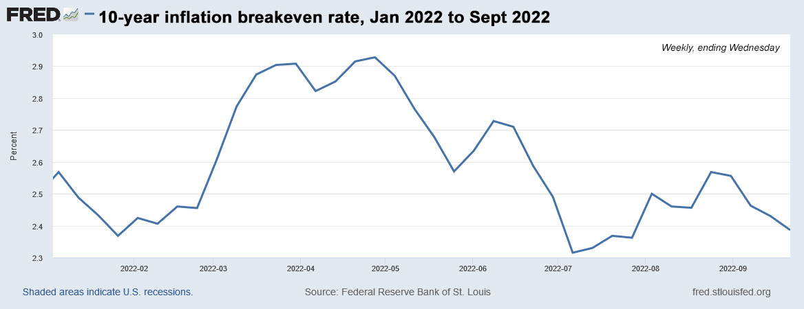 Although 2.43% for a 10-year inflation breakeven rate is historically high, it seems very reasonable at a time when U.S. inflation is running at 8.3%. Inflation over the last 10 years, ending in August, has averaged 2.5%.