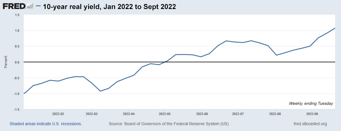 Here is the year-to-date trend in 10-year real yields, showing the steady surge higher since the Federal Reserve unveiled its inflation-fighting plans in March: