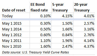 1. Since EE bonds do not have coupons, the appropriate comparison to Treasurys is 20-year zero coupon Treasury bonds, not coupon-paying bonds. Right now, 20 year coupon bonds are yielding 4.19% to maturity and their zero coupon cousins are yielding 4.31%; that’s a substantial difference. Both outpace EE bond yields so substantially that it is hard to justify purchasing EE bonds right now. And for people worried about mark-to-market values of Treasurys prior to maturity, it would help to remind them that if they were willing to hold EE bonds for 20 years, they should think of the same holding period to maturity in Treasurys and not even pay attention to mark-to-market losses or gains prior to maturity.