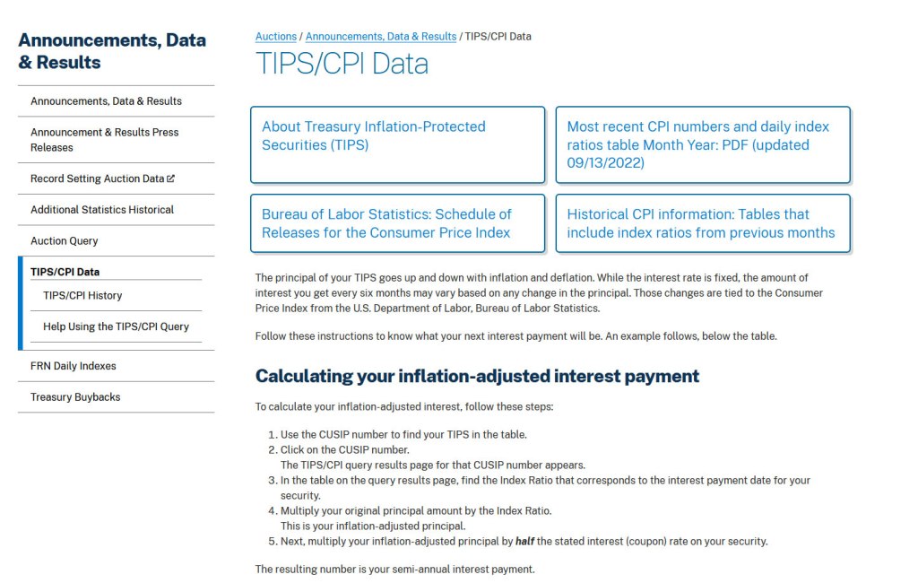 Inside the auction results section there is a nice guide to TIPS/CPI Data, which was probably on the old site — I must have used it — but I couldn’t have found it easily. (TreasuryDirect emails me the new TIPS inflation indexes a few minutes after the release of each monthly inflation report, so that was my reliable source.)