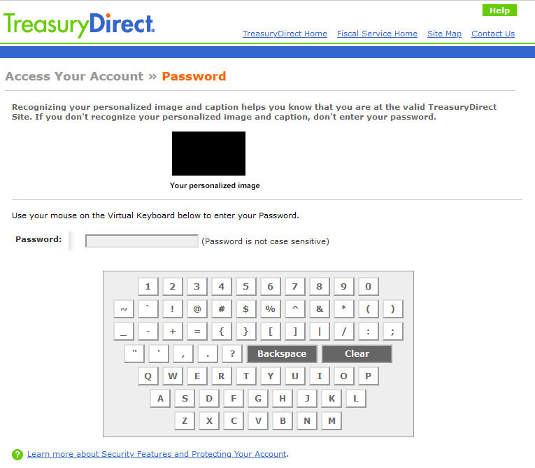 It’s the virtual keyboard, and TreasuryDirect is the only site I have ever seen that uses one. This login method triggers hilarity around the financial internet, but I am saying: I LIKE IT. TreasuryDirect is taking this step to keep your password safe from keystroke tracking spyware, also called “keyloggers.” I want TD to take every step possible to protect my account.