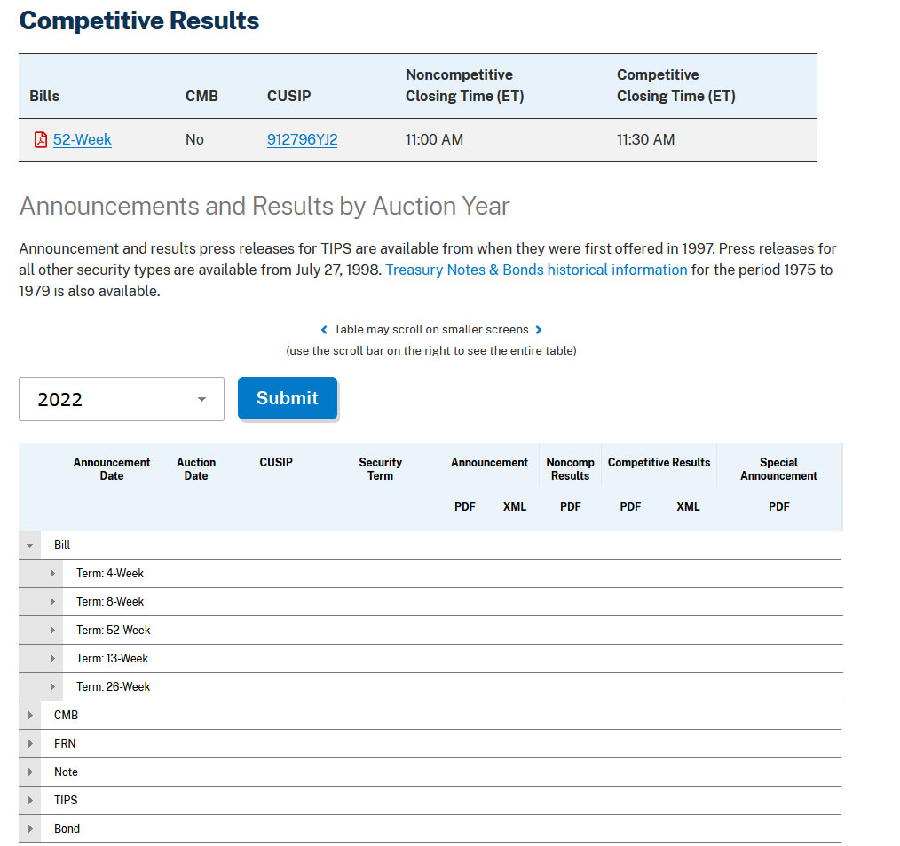 I use TreasuryDirect several times a week to check on auction results for TIPS and T-bills. The same functionality is on the new site, but the look is updated. This morning, when I tried to see the 1-year T-bill auction result, I got nothing. The page never finished loading the results portion, which also happened often on the old site. Later, it worked. I would really like this to work, every time. This is the opening page.