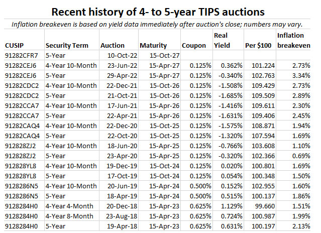Here is a history of recent 4- to 5-year TIPS auctions, showing the long string of recent auctions with a coupon rate of 0.125%. Thursday’s result should be much higher: