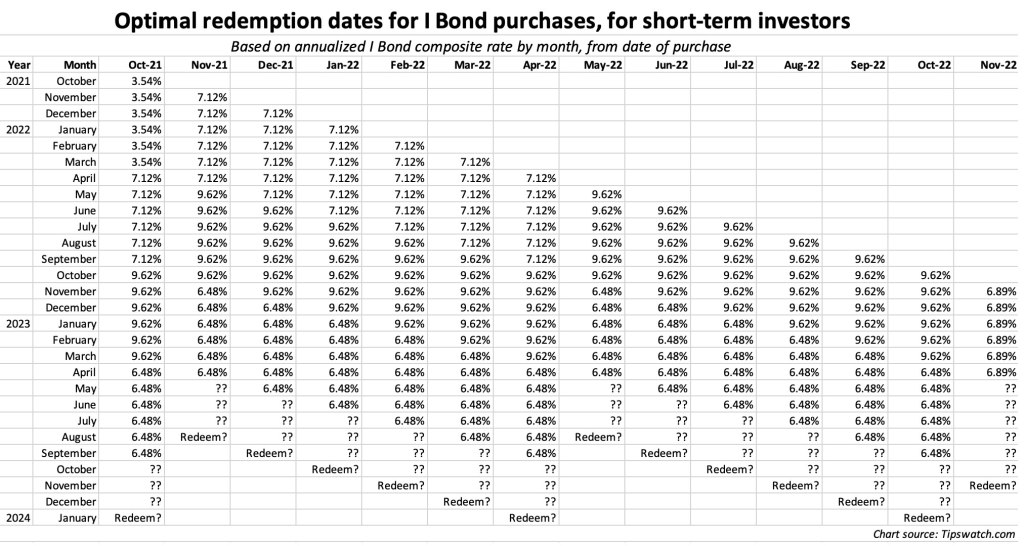 And so on through the chart. A lot of people bought I Bonds in October 2022, crashing the TreasuryDirect system. Those people will collect 9.62% for six months, then 6.48% for six months. Add 3 months and you get to an optimal redemption month of January 2024.
