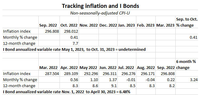 For I Bonds. The October report is the first in a series of six — from October to March — that will determine the I Bond’s new inflation-adjusted variable rate, which will be reset May 1. So far, that increase is 0.41%, but just one month of data is meaningless. Here are the numbers:
