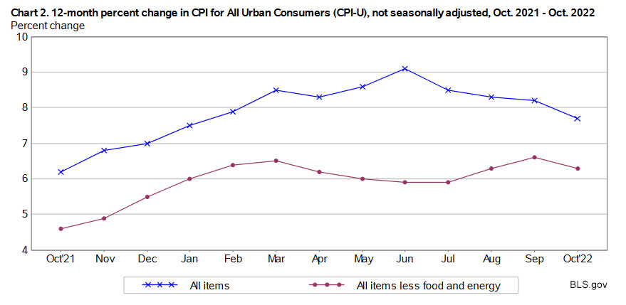 The Consumer Price Index for All Urban Consumers (CPI-U) rose 0.4% in October on a seasonally adjusted basis, the U.S. Bureau of Labor Statistics reported. Over the last 12 months, the all-items index increased 7.7%. Core inflation, which removes food and energy, rose 0.3% for the month and 6.3% year over year. All of these numbers were below expectations, as shown in the chart.