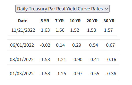 I imagine that a lot of I Bond faithful will disagree with my opinion, and I do understand that I Bonds are very attractive because of their simplicity, safety and rock-solid deflation protection. But TIPS are just a better investment in November 2022. Real yields of 1.5% are now available across the TIPS yield spectrum. Is that attractive? Just take a look at where we were a few months ago: