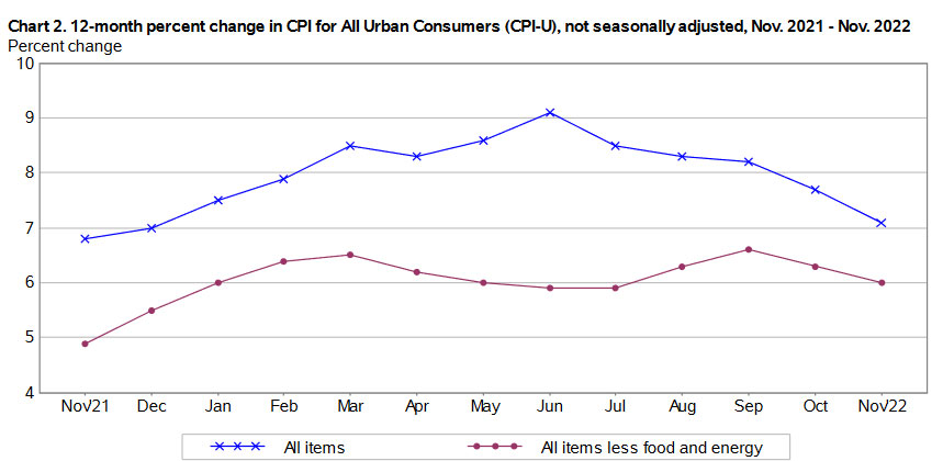 The Consumer Price Index for All Urban Consumers rose just 0.1% in November on a seasonally adjusted basis, the U.S. Bureau of Labor Statistics reported today. Over the last 12 months, the all-items index increased 7.1%. Both of those numbers were below expectations of 0.3% for the month and 7.3% year over year.