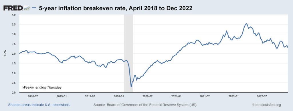 Here is the trend in the 5-year inflation breakeven rate over the last 4 1/2 years, showing that inflation expectations have been sliding lower since March 2022.