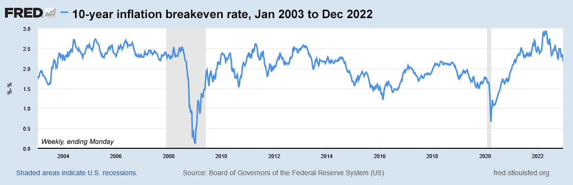 Keep in mind that the inflation breakeven rate isn’t a great predictor of future inflation. It just measures market sentiment. Here is the trend in the 10-year inflation breakeven rate from 2003 to 2022. Look at the 2012 to 2108 era. Do you see any prediction or even hint of our current surge to 40-year-high inflation, topping 7% a year over the last two years?