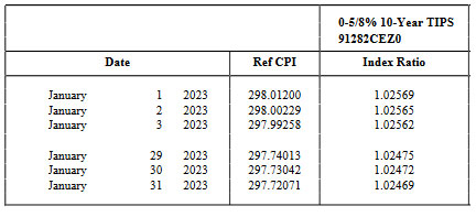 Each month, on the day the U.S. inflation report is released, the Treasury issues new inflation index ratios for all TIPS for the month two months ahead of the report. Here is the full list of January inflation indexes, based on November inflation. And here is how those numbers look for the TIPS issued in July, CUSIP 91282CEZ0: